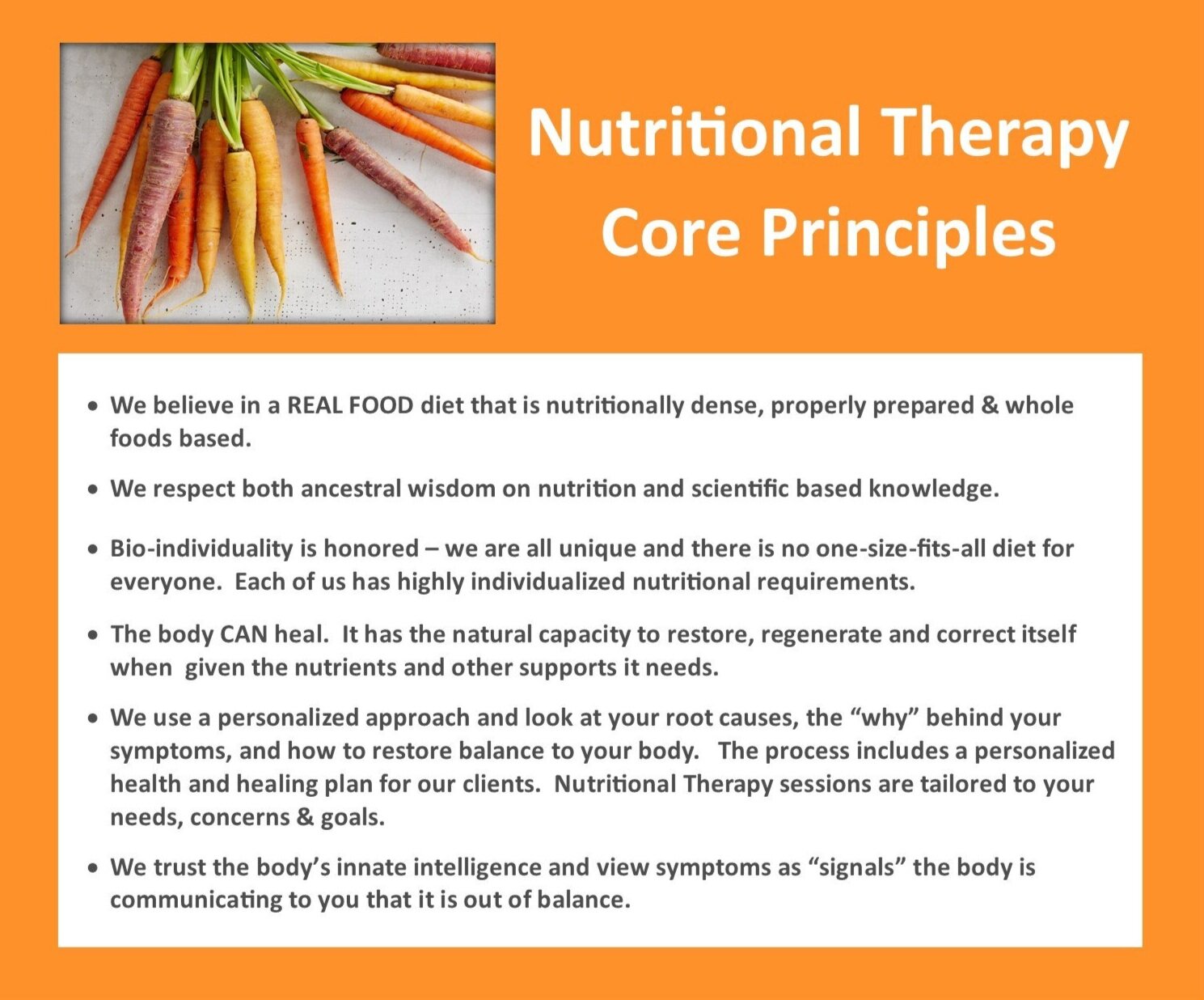 Nutritional Therapy centers on the belief that real health can be achieved through a holistic and bio-individual approach to nutrition and lifestyle. This functional approach to health focuses on restoring balance to the body through a nutrient dense diet, natural therapies, supporting the physiological foundations of health and lifestyle changes.